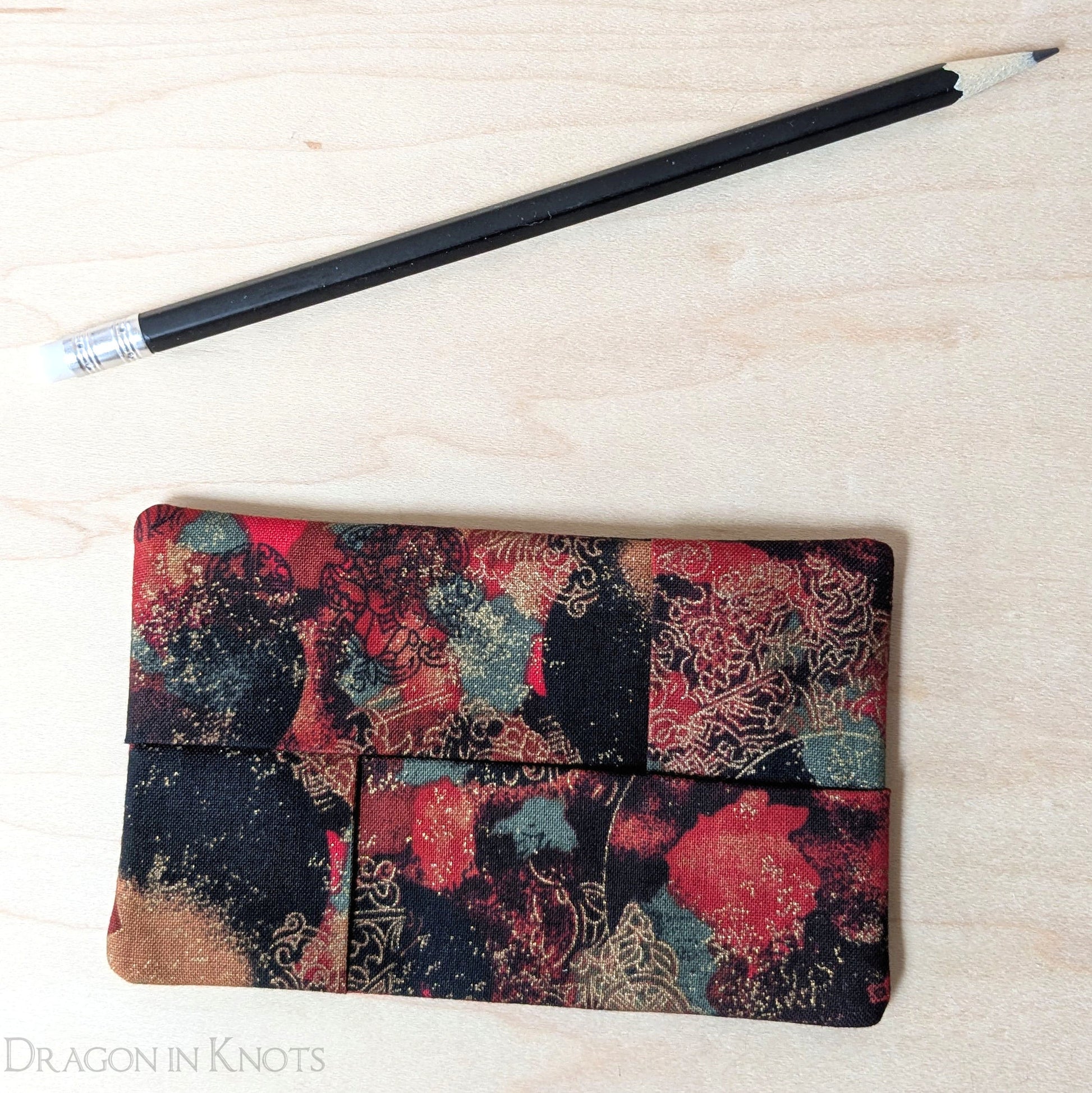 Keep facial tissues on hand when out and about in this elegant pocket tissue holder. It is made with a black fabric with splashes of red, green, and mustard; as well as metallic golden accents.
