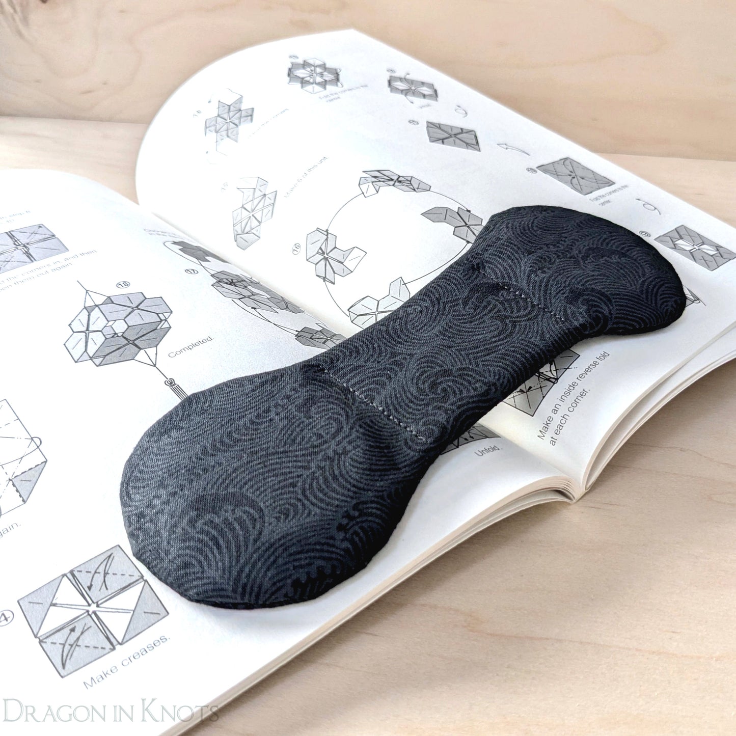 A black book weight with an ocean waves design in dark gray to help hold your book open to the right page.