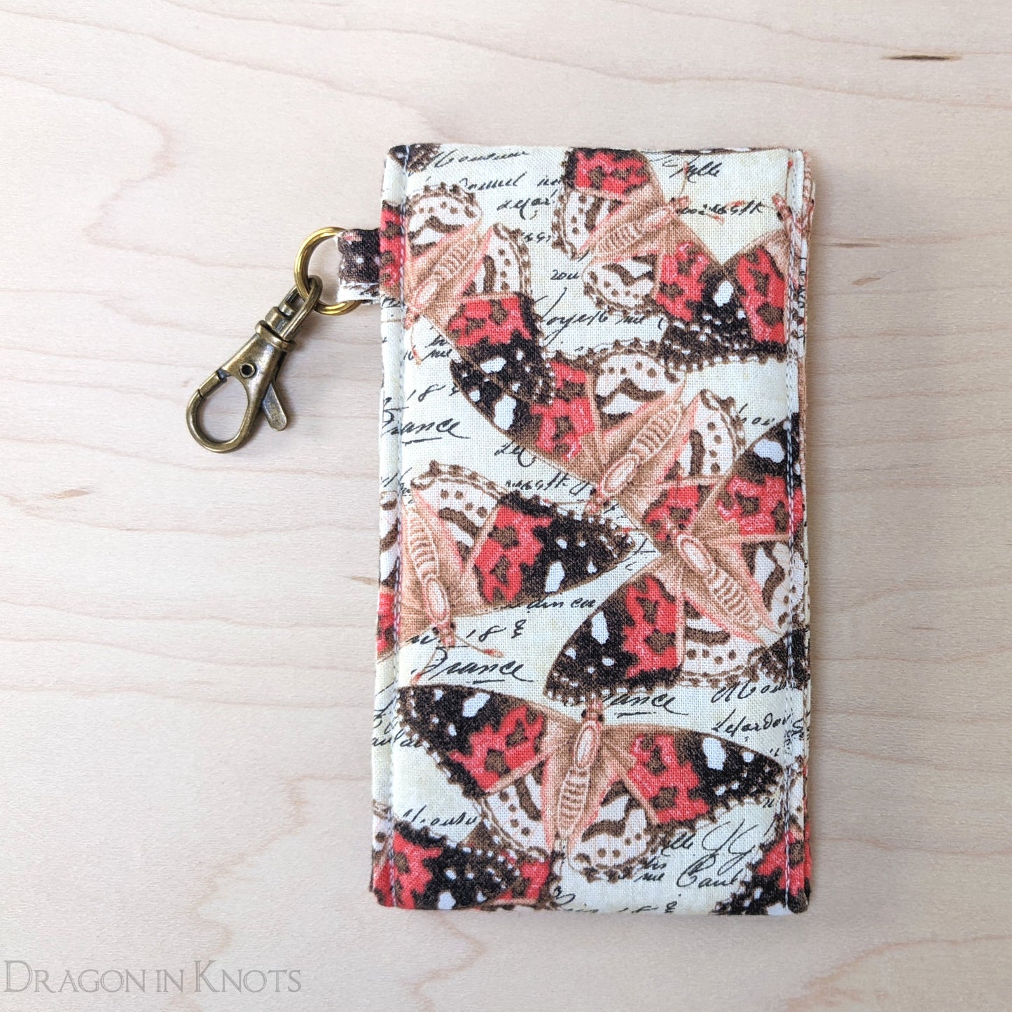 This vintage-inspired pouch features colorful moths on a script background. It is designed to hold lip gloss, or similarly sized concealer and mascara tubes.
