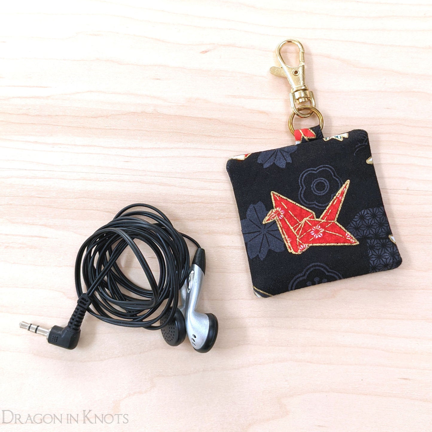 A red origami crane graces the front of this black keychain pouch. Two origami butterflies, an origami pinwheel, and an origami doll appear on the back.