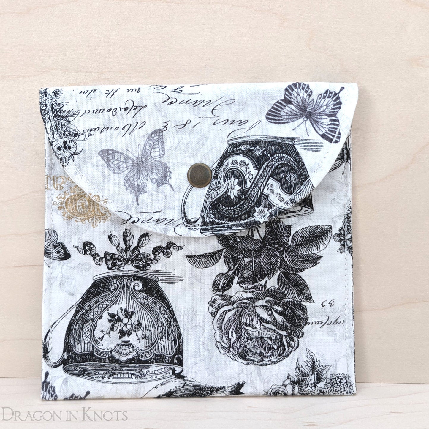 The Eiffel Tower, a butterfly, and teacups adorn this romantic pouch.